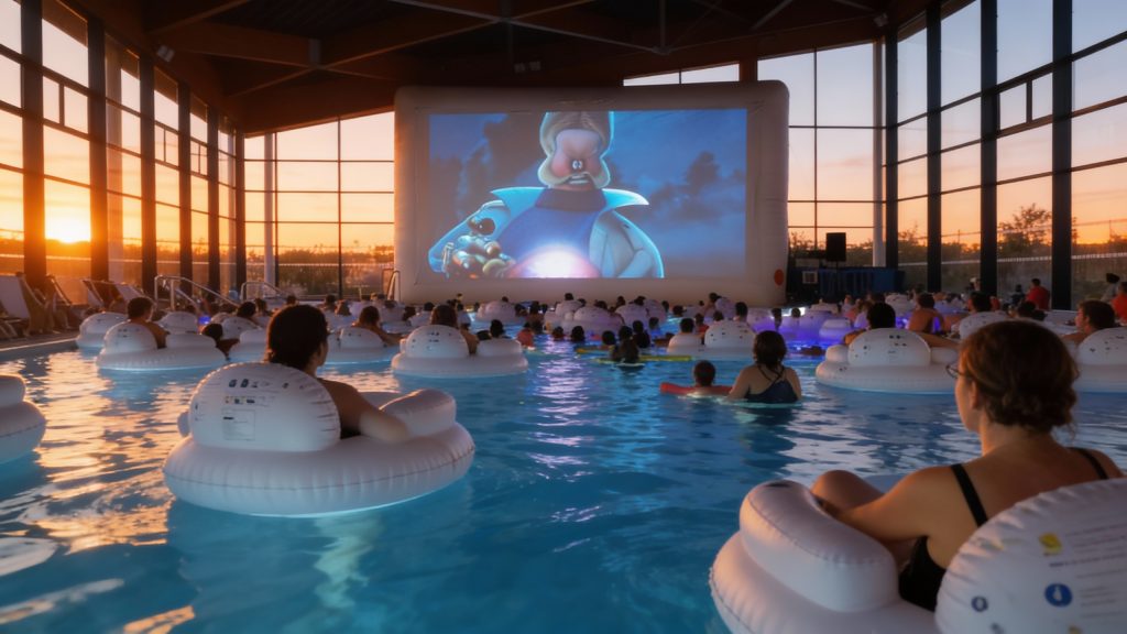 CinéPiscine réinvente l’usage de vos équipements aquatiques en proposant une expérience culturelle originale et fédératrice. Le temps d’une soirée, le bassin devient un espace de projection éphémère, créant un rendez-vous estival attractif qui valorise votre site, élargit les publics et renforce l’image de votre établissement.